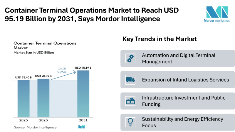 According to Mordor Intelligence, the global container terminal operations market size was valued at USD 75.40 billion in 2025 and is estimated at USD 78.39 billion in 2026, with projections indicating it will reach USD 95.19 billion by 2031 at a CAGR of 3.96%. This steady container terminal operations market growth reflects the essential role ports play in international trade and supply chains. Rising cargo volumes, the expansion of maritime routes, and the arrival of ultra-large container vessels above 18,000 TEU are reshaping how terminals operate worldwide.