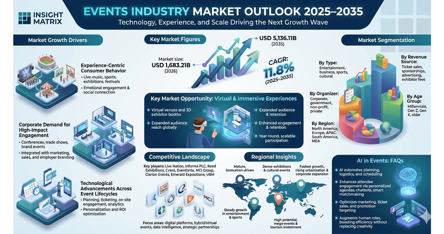 The Events Industry Market is undergoing a remarkable transformation, fueled by rapid technological innovation, shifting consumer expectations, and the increasing importance of experiential engagement. According to recent market insights, the industry is projected to grow significantly from a market size of USD 1,683.21 billion in 2025 to an impressive USD 5,136.11 billion by 2035, registering a robust compound annual growth rate (CAGR) of 11.8% during the forecast period (2025–2035).