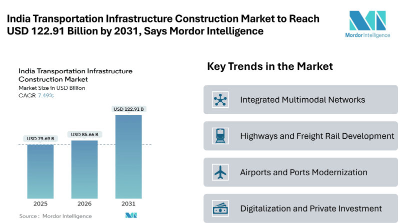 According to Mordor Intelligence, the India transportation infrastructure construction market size was valued at USD 79.69 billion in 2025 and is estimated to grow to USD 85.66 billion in 2026, reaching USD 122.91 billion by 2031, at a CAGR of 7.49% during the forecast period (2026–2031). This steady expansion reflects sustained public investment, policy continuity, and rising demand for efficient mobility across road, rail, air, and maritime networks. The India transportation infrastructure construction industry is witnessing strong project pipelines supported by government programs aimed at improving logistics efficiency, reducing travel time, and supporting economic activity across regions.