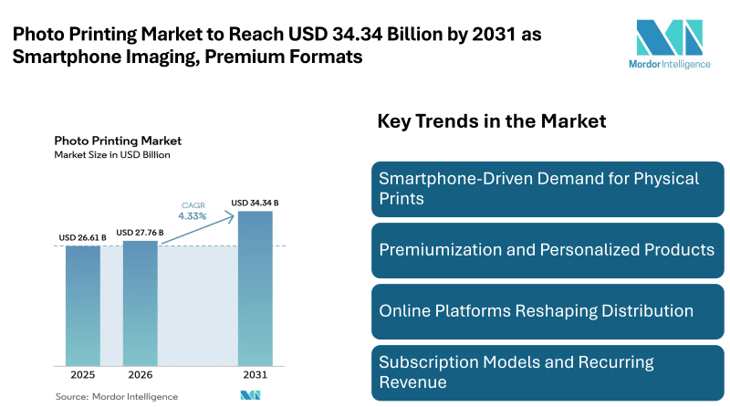 According to Mordor Intelligence, the global photo printing market size was valued at USD 26.61 billion in 2025 and is estimated at USD 27.76 billion in 2026, projected to reach USD 34.34 billion by 2031 at a CAGR of 4.33%. This steady expansion reflects sustained demand for physical photo products despite the dominance of digital storage. Consumers continue to convert digital memories into tangible keepsakes, supporting consistent growth across both consumer and professional segments. Three core factors support the positive market forecast. First, smartphone photography has become universal, dramatically increasing the volume of images captured daily. Second, consumers still value physical prints for gifting, décor, and archiving.