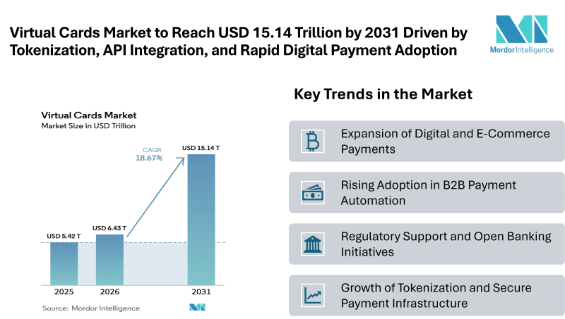 According to Mordor Intelligence, the virtual cards market size is expected to witness strong growth, expanding from USD 5.42 trillion in 2025 to USD 6.43 trillion in 2026, and reaching approximately USD 15.14 trillion by 2031. This reflects a robust compound annual growth rate of 18.67%. This rapid expansion is being fueled by the increasing convergence of payment systems and software platforms, enabling virtual cards to offer highly programmable and API-driven payment experiences. Innovations in tokenization are significantly enhancing transaction security, improving authorization rates, and reducing fraud across digital and in-app commerce environments. At the same time, the rise of open banking frameworks is streamlining funding and settlement processes by enabling standardized data sharing through APIs. Enterprises, particularly treasury departments, are accelerating adoption as virtual cards provide automated reconciliation, enhanced spend control, and improved working capital management.